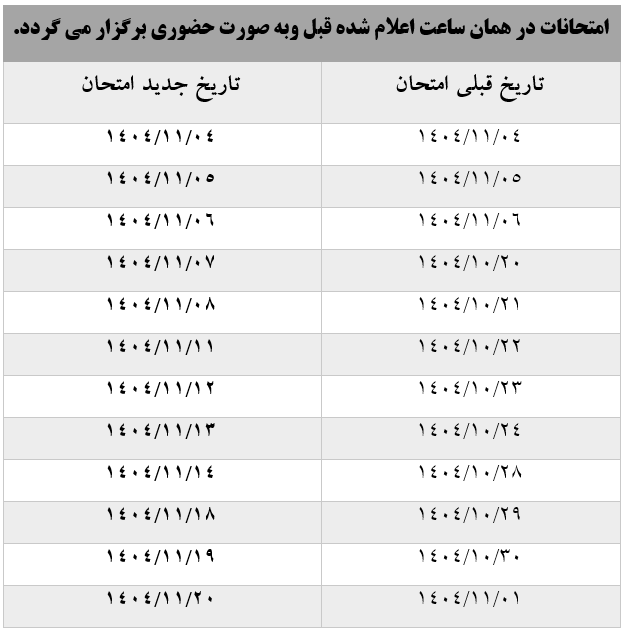• ضمناً جدول تغییرات در زمان‌بندی امتحانات نیم‌سال اول 1405-1404 به شرخ ذیل می باشد.